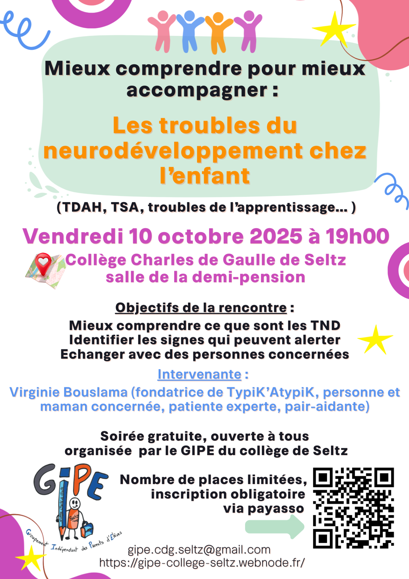 Le GIPE organise une soirée thématique sur les troubles du neurodéveloppement chez l'enfant le vendredi 10 octobre 2025 à 19h00 au collège, dans la salle de la demi-pension.